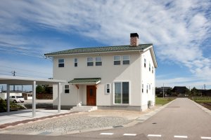 青空に映える緑の屋根と真っ白な塗り壁