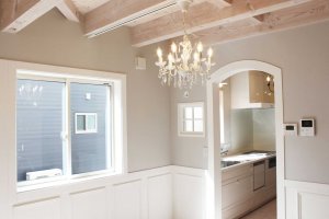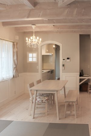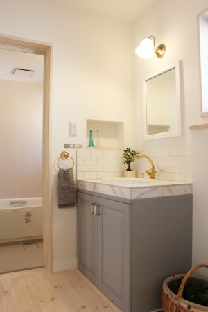 施工実例 ヨーロッパに佇むような白くてかわいい家 塗り壁にブリックタイル オレンジの屋根の外観がこのおうちの目印 味わいのある無垢のパイン材と 真っ白なタイルの造作洗面台やシャンデリア こだわりをめいっぱいちりばめた かわいいおうちが完成しました ギャラリー 施工実例に戻る