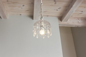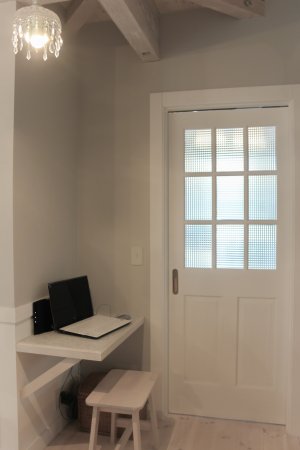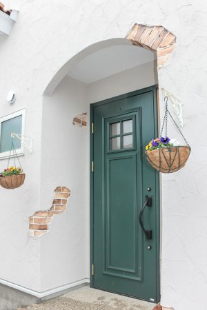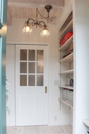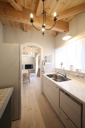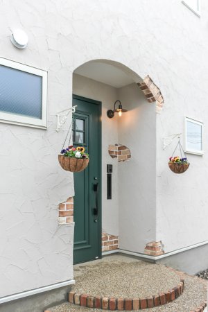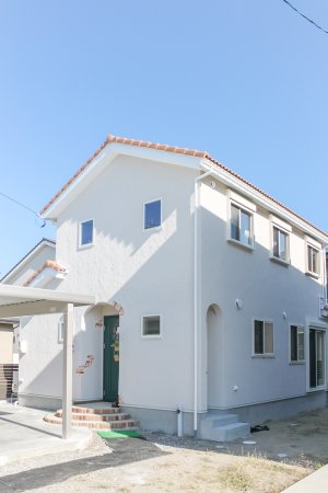 ヨーロッパに佇むような白くてかわいい家 塗り壁にブリックタイル オレンジの屋根の外観がこのおうちの目印 味わいのある無垢のパイン材と 真っ白なタイルの造作洗面台やシャンデリア こだわりをめいっぱいちりばめた かわいいおうちが完成しました ギャラリー