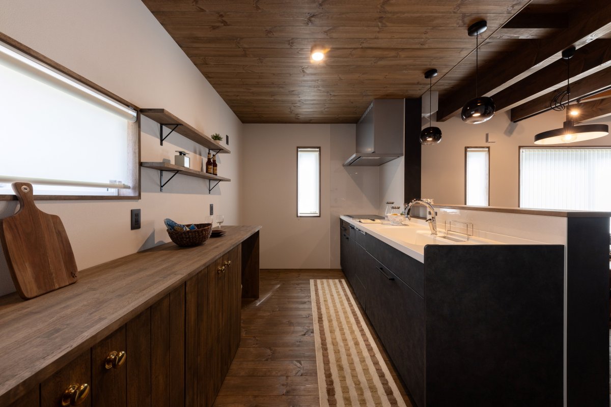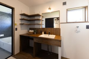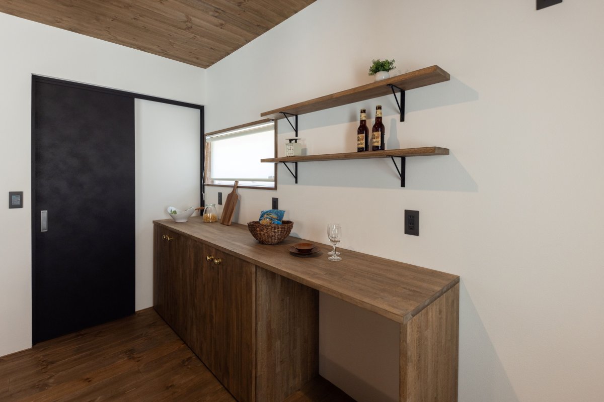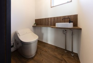 キッチンカウンター収納、洗面カウンター、トイレ手洗いは造作で、統一感のある空間になりました。