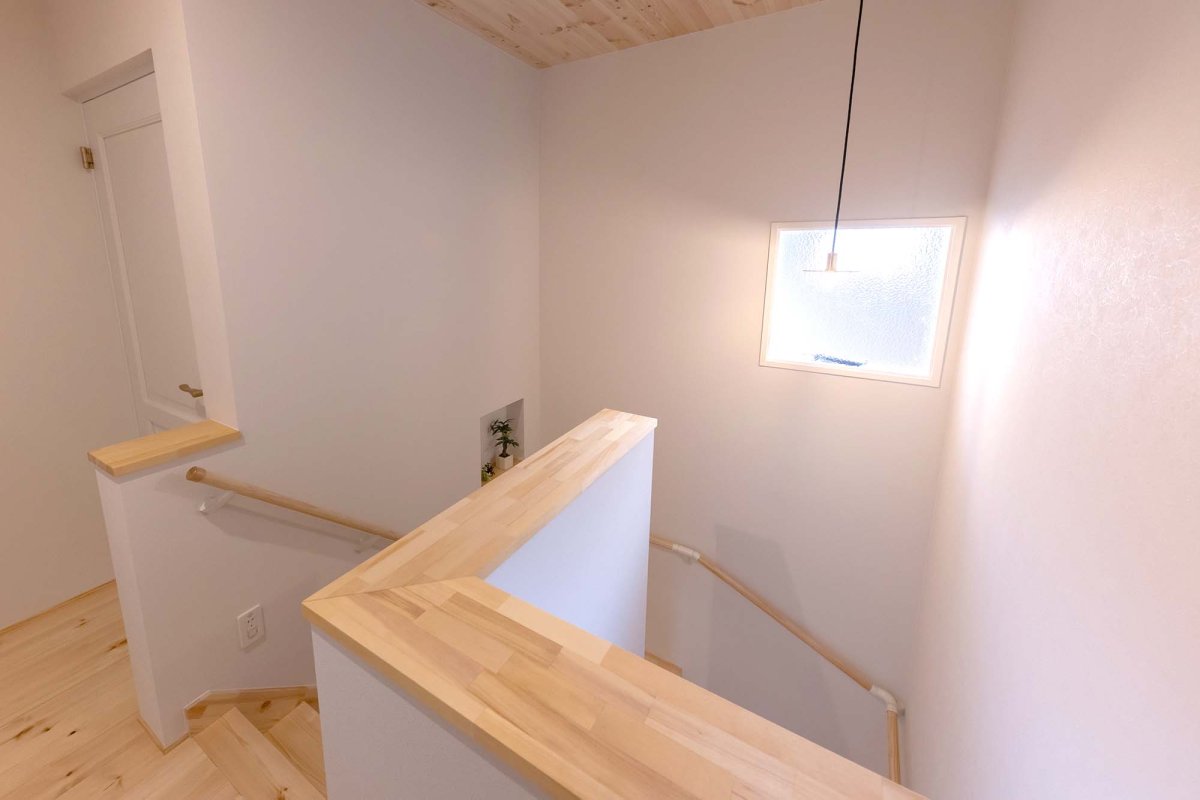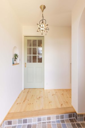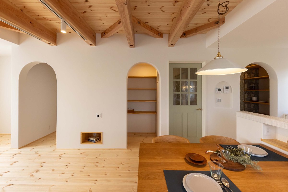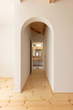 白の塗り壁と無垢材による自然な風合いを基調に丸いアール壁やニッチを取り入れ、