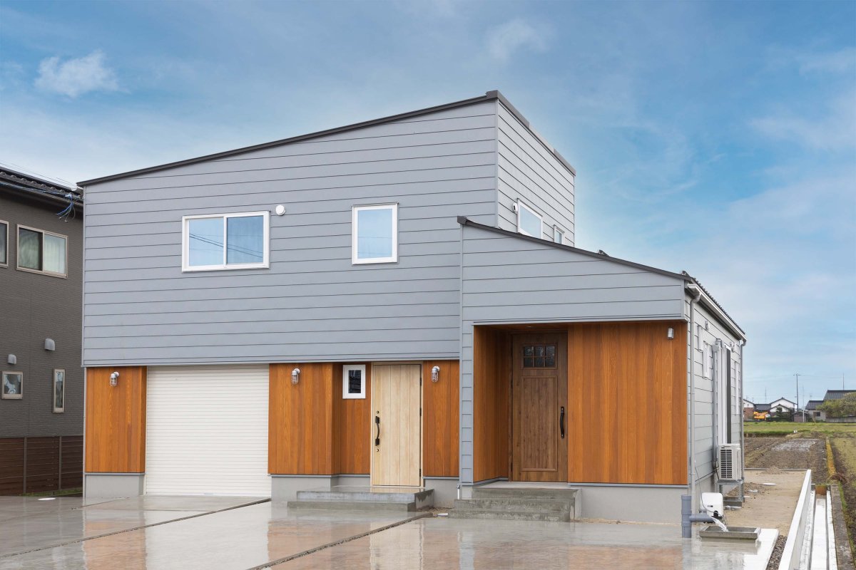 外観はグレーのガルバリウム鋼板に板張りのアクセントを効かせ、スタイリッシュな印象に。