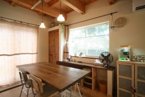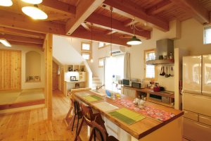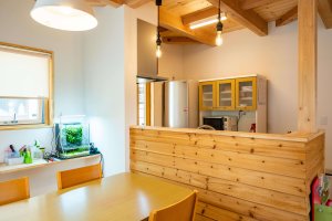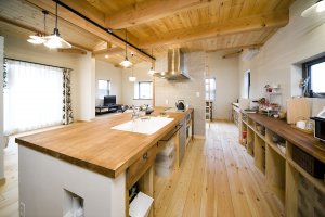 ダイニングとキッチンが一体型のオリジナル造作キッチンや手づくりお風呂など