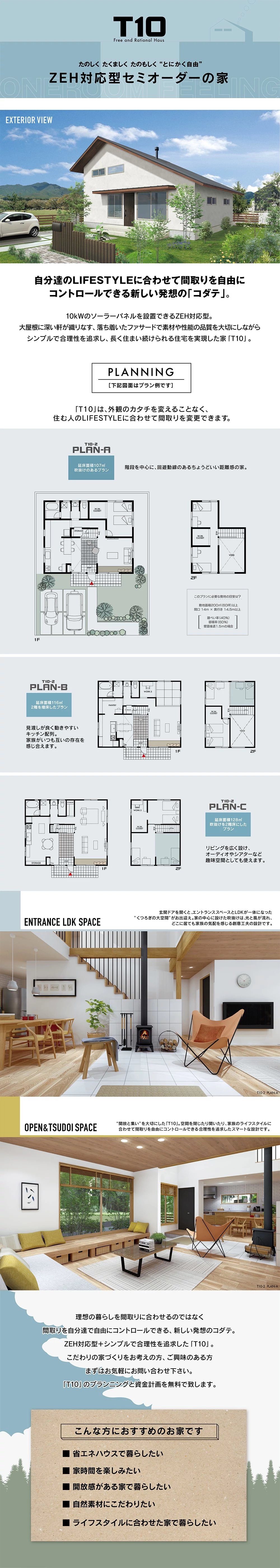 理想の暮らしを間取りに合わせるのではなく間取りを自分達で自由にコントロールできる、新しい発想のコダテ。 ZEH対応型+シンプルで合理性を追求した「T10」。 こだわりの家づくりをお考えの方、ご興味のある方まずはお気軽にお問い合わせ下さい。 「T10」のプランニングと資金計画を無料で致します。